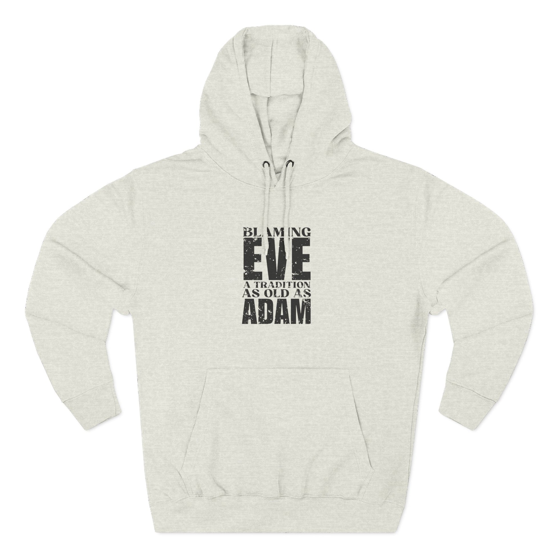'Blaming Eve A tradition as old as Adam' Three-Panel Fleece Hoodie - Unisex - Distressed Font.