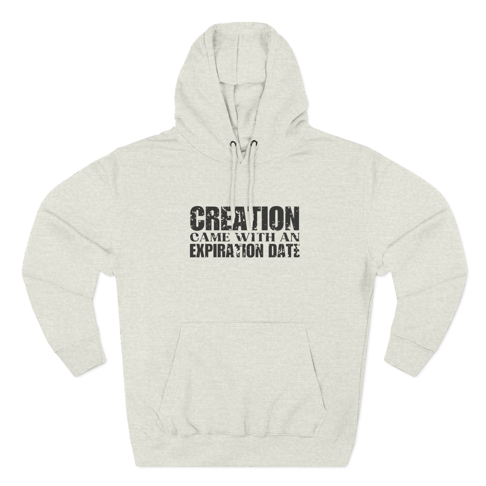 'Creation came with an expiration date' Three-Panel Fleece Hoodie - Unisex - Distressed Font.