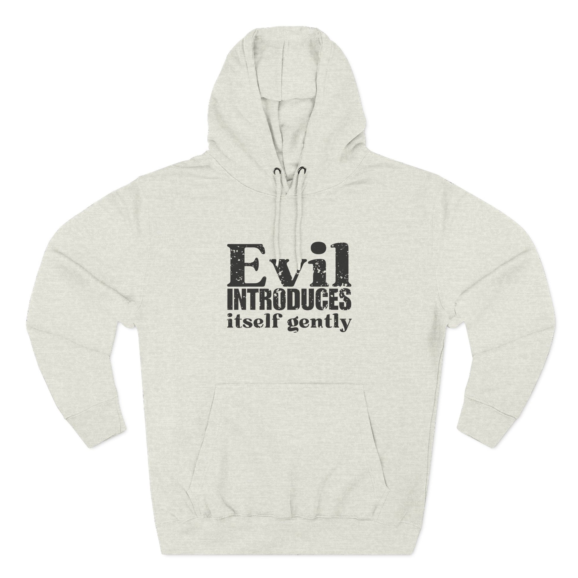'Evil introduces itself gently' Three-Panel Fleece Hoodie - Unisex - Distressed Font.