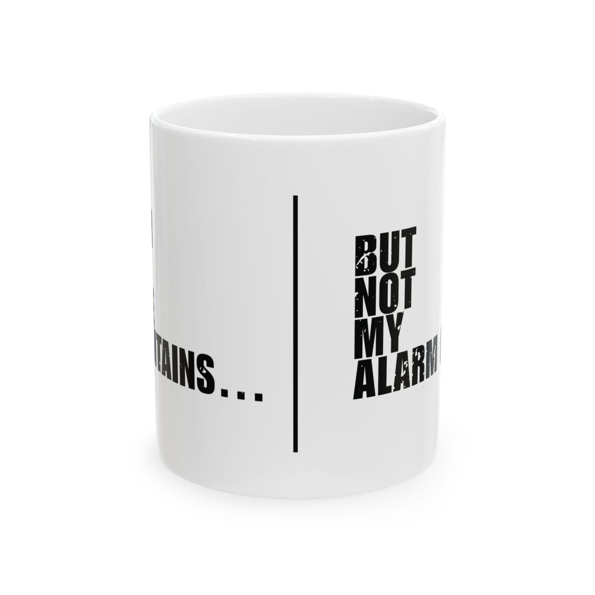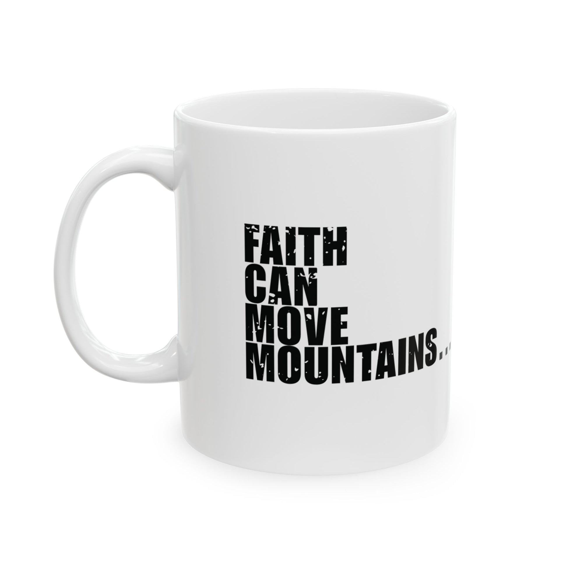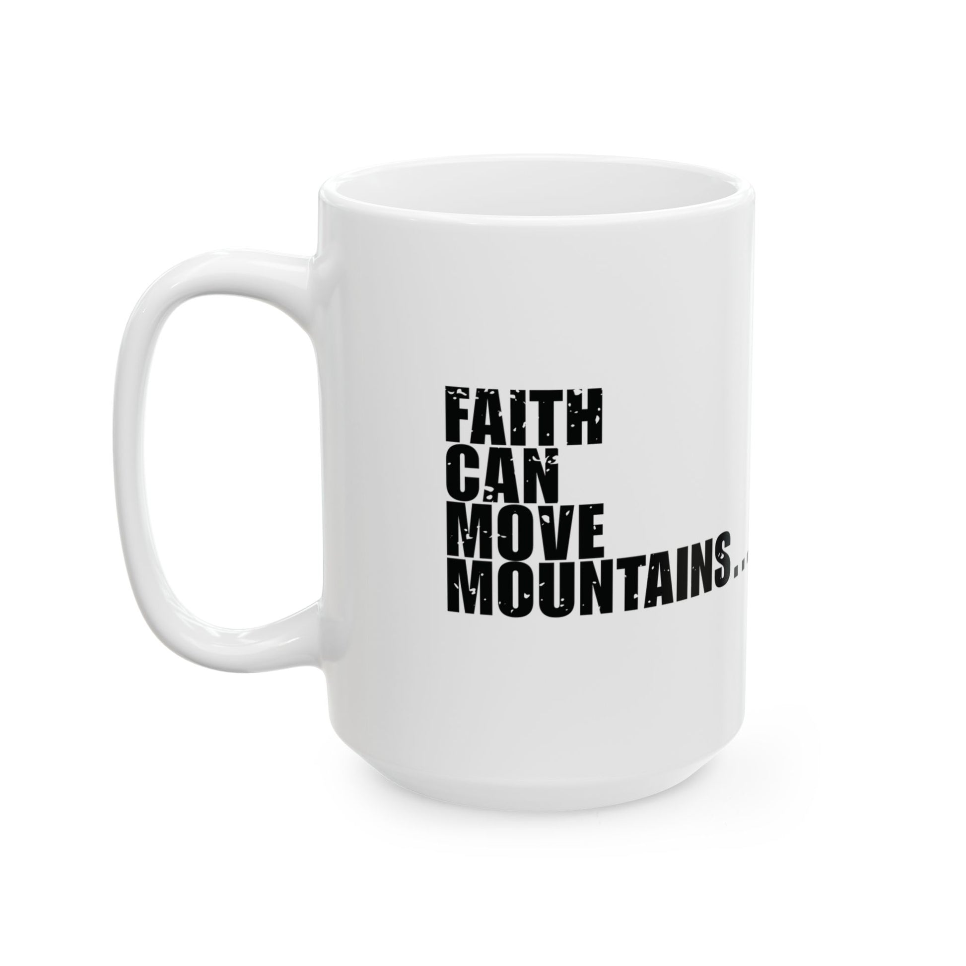 'Faith can move mountains… but not my alarm clock' - Mug - (11oz, 15oz) - White - Distressed font.