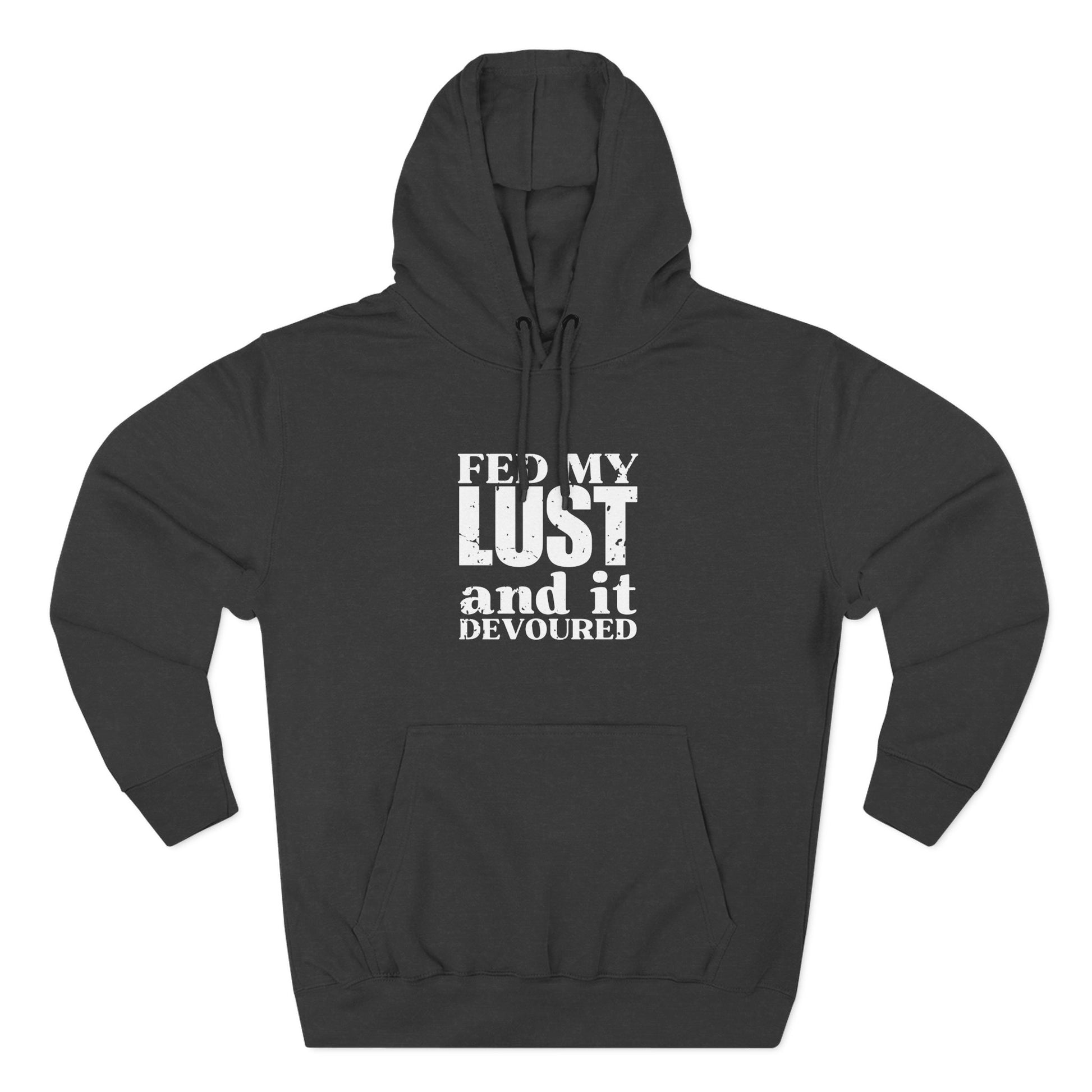 'fed my lust, and it devoured' Three-Panel Fleece Hoodie - Unisex - Distressed Font.