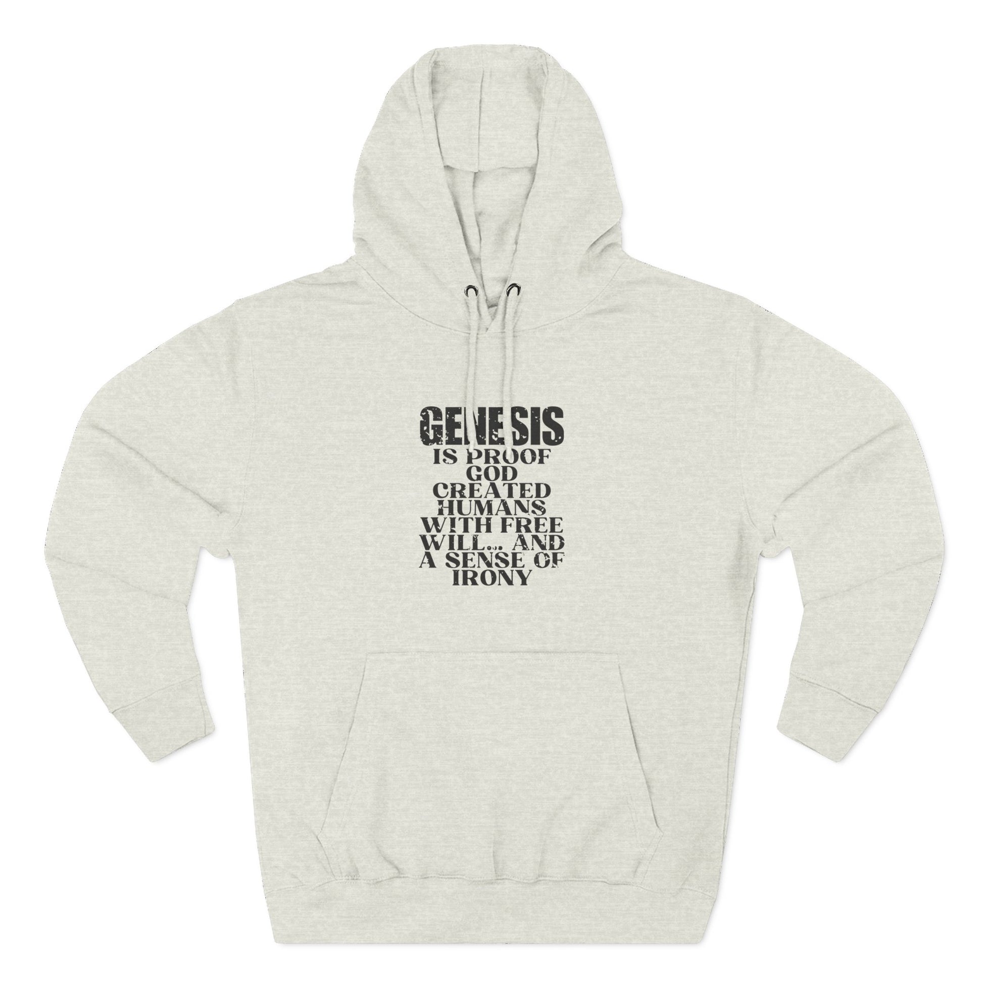 'Genesis is proof God created humans with free will… and a sense of irony' Three-Panel Fleece Hoodie - Unisex - Distressed Font.