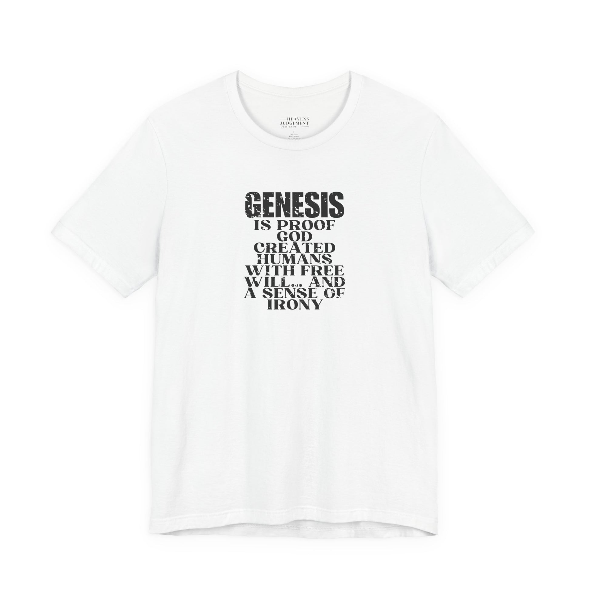 'Genesis is proof God created humans with free will… and a sense of irony' T-Shirt - Unisex - Distressed Font.