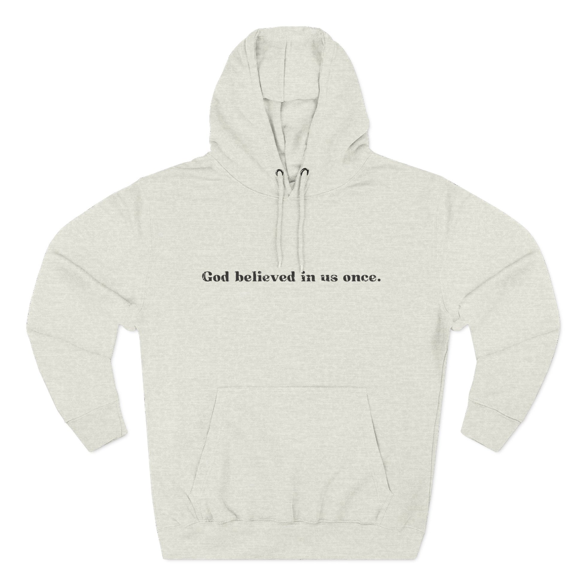 'God believed in us once' Three-Panel Fleece Hoodie - Unisex - Distressed Font.