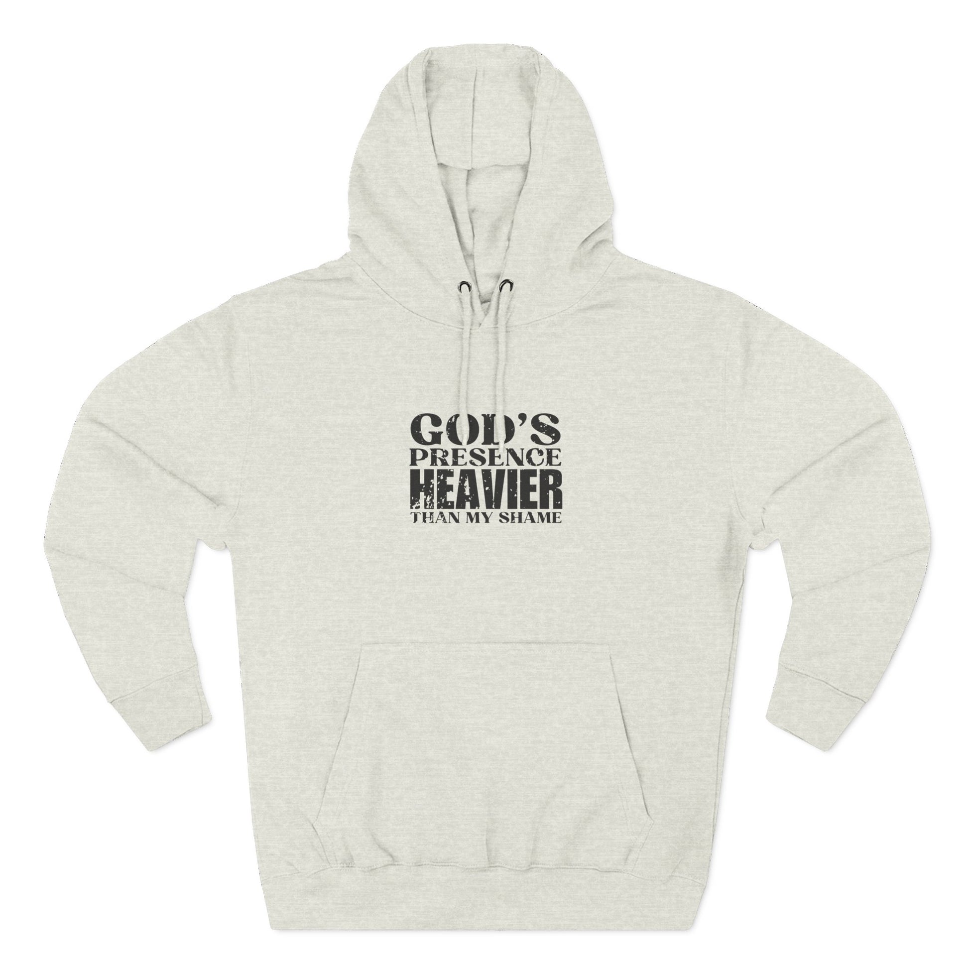 'God’s presence was heavier than my shame' Three-Panel Fleece Hoodie - Unisex - Distressed Font.