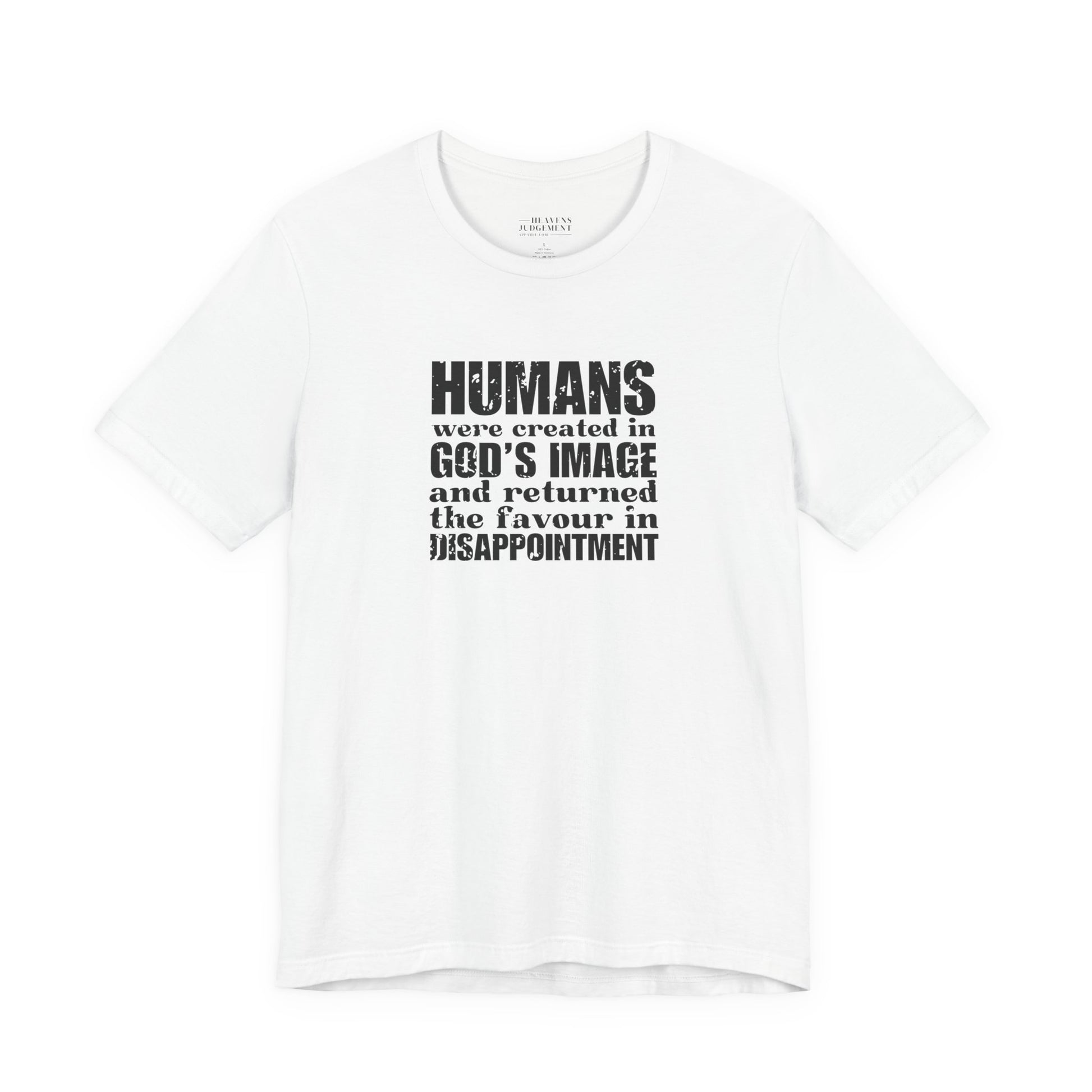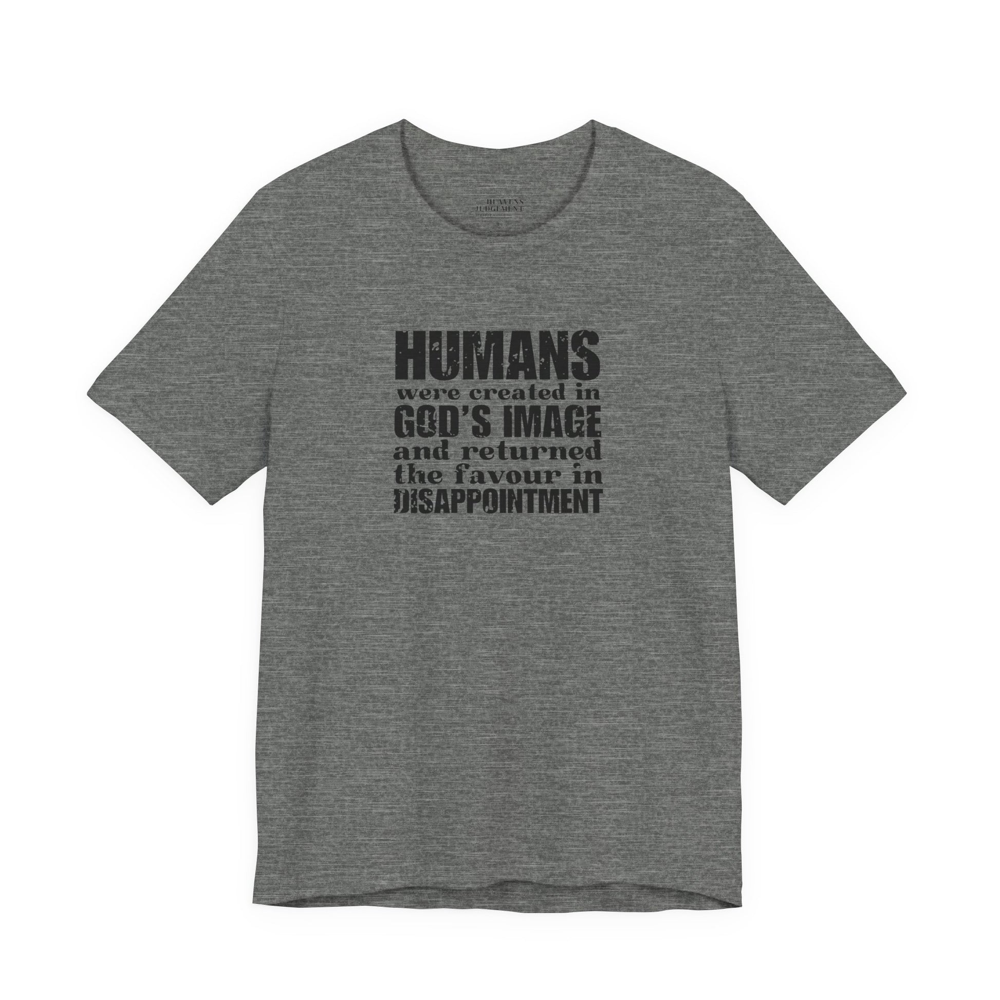 'Humans were created in God’s image… and returned the favour in disappointment' T-Shirt - Unisex - Distressed Font.