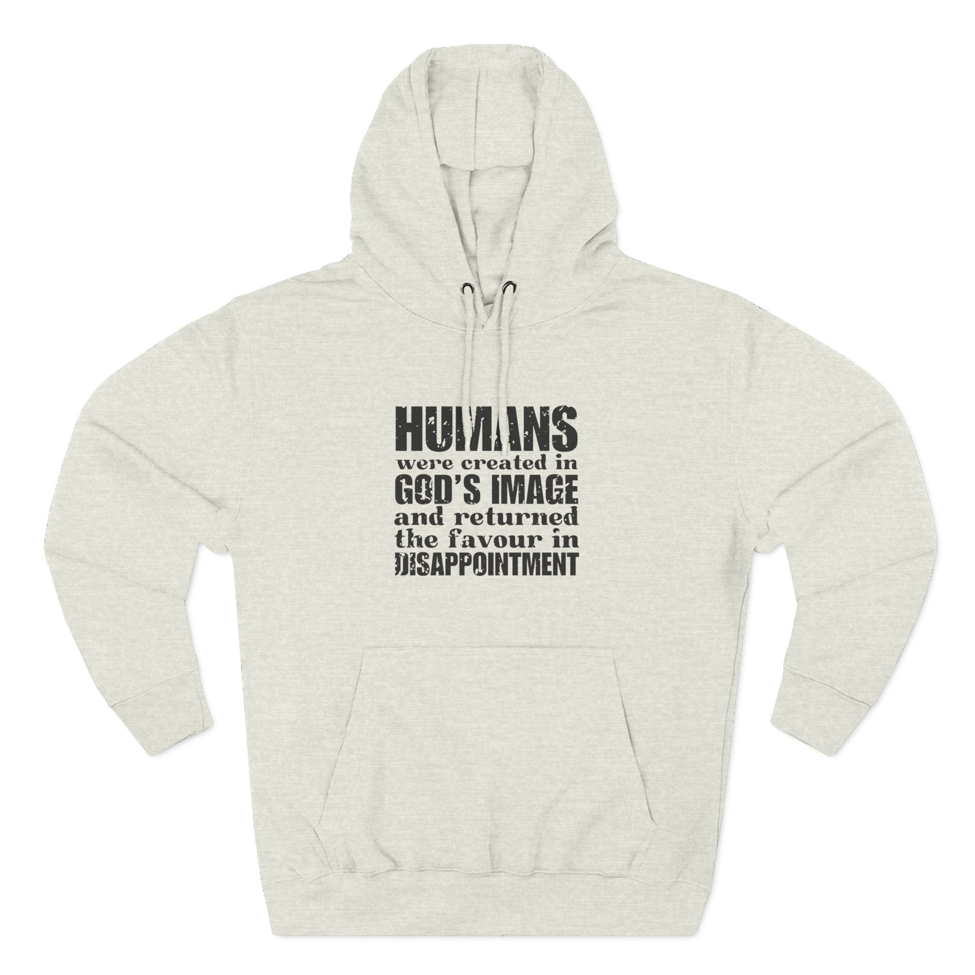 'Humans were created in God’s image… and returned the favour in disappointment' Three-Panel Fleece Hoodie - Unisex - Distressed Font.