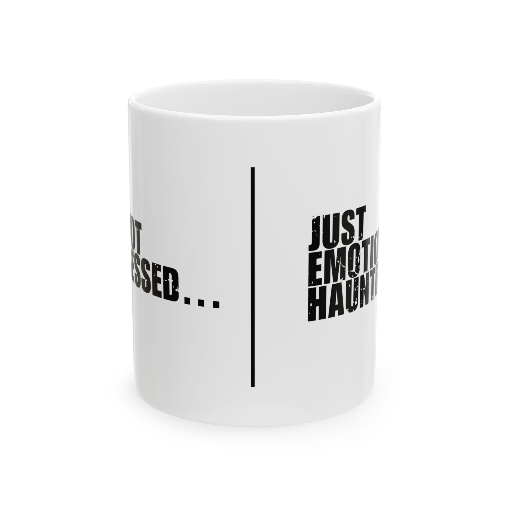 'I’m not possessed… just emotionally haunted' - Mug - (11oz, 15oz) - White - Distressed font.