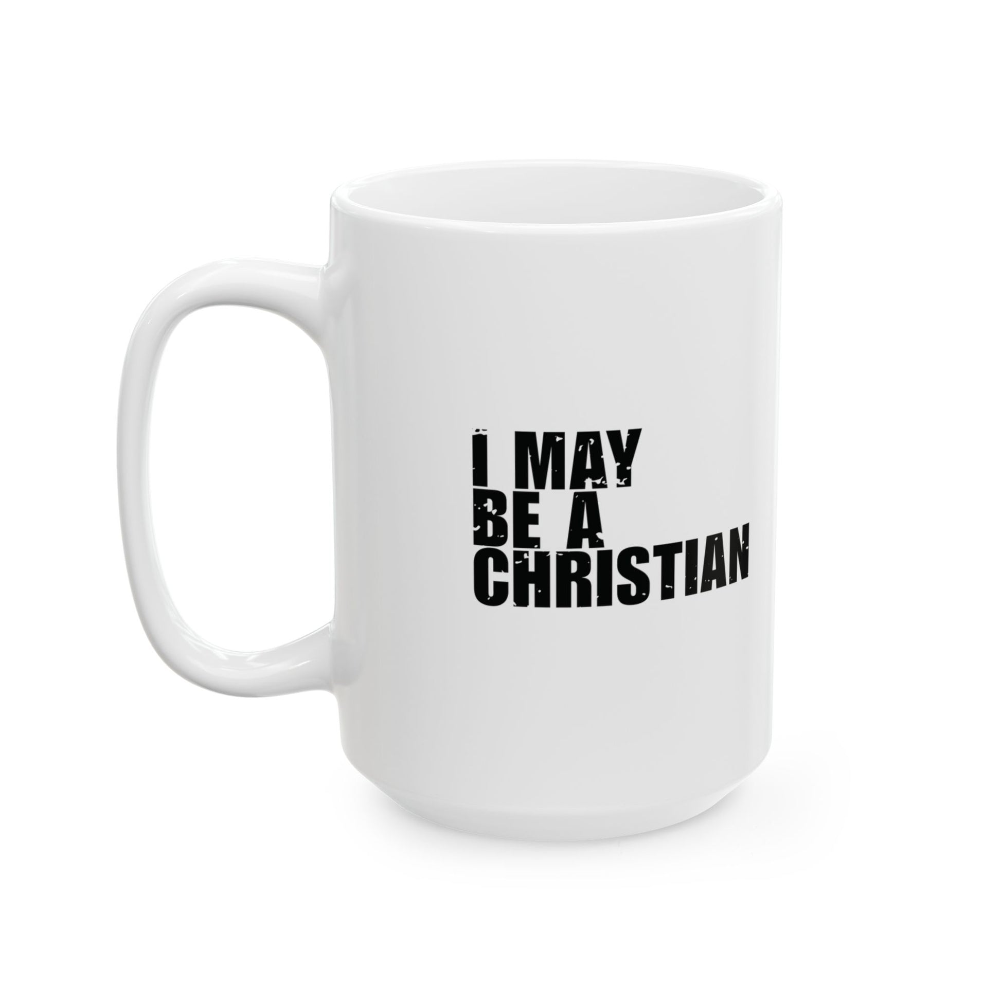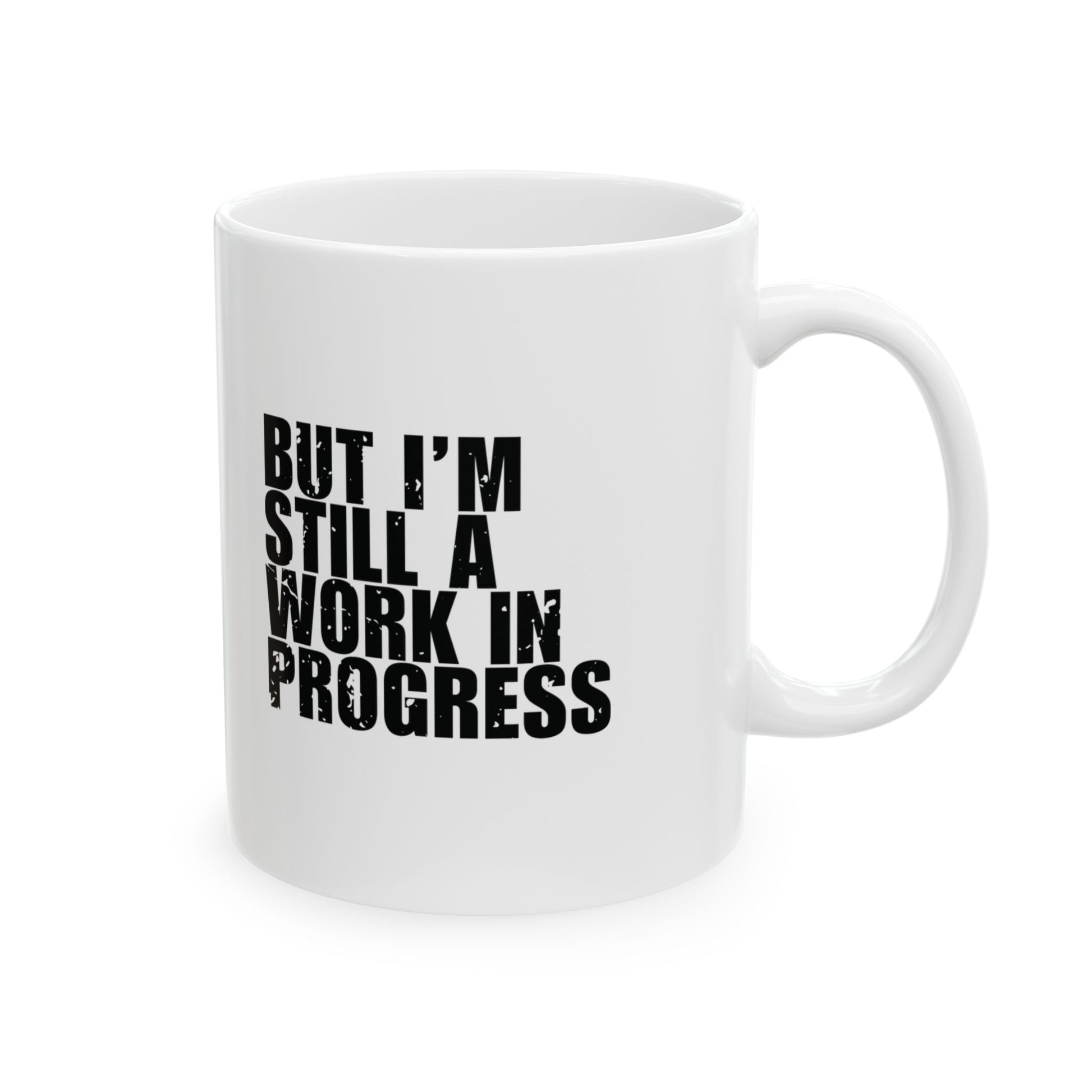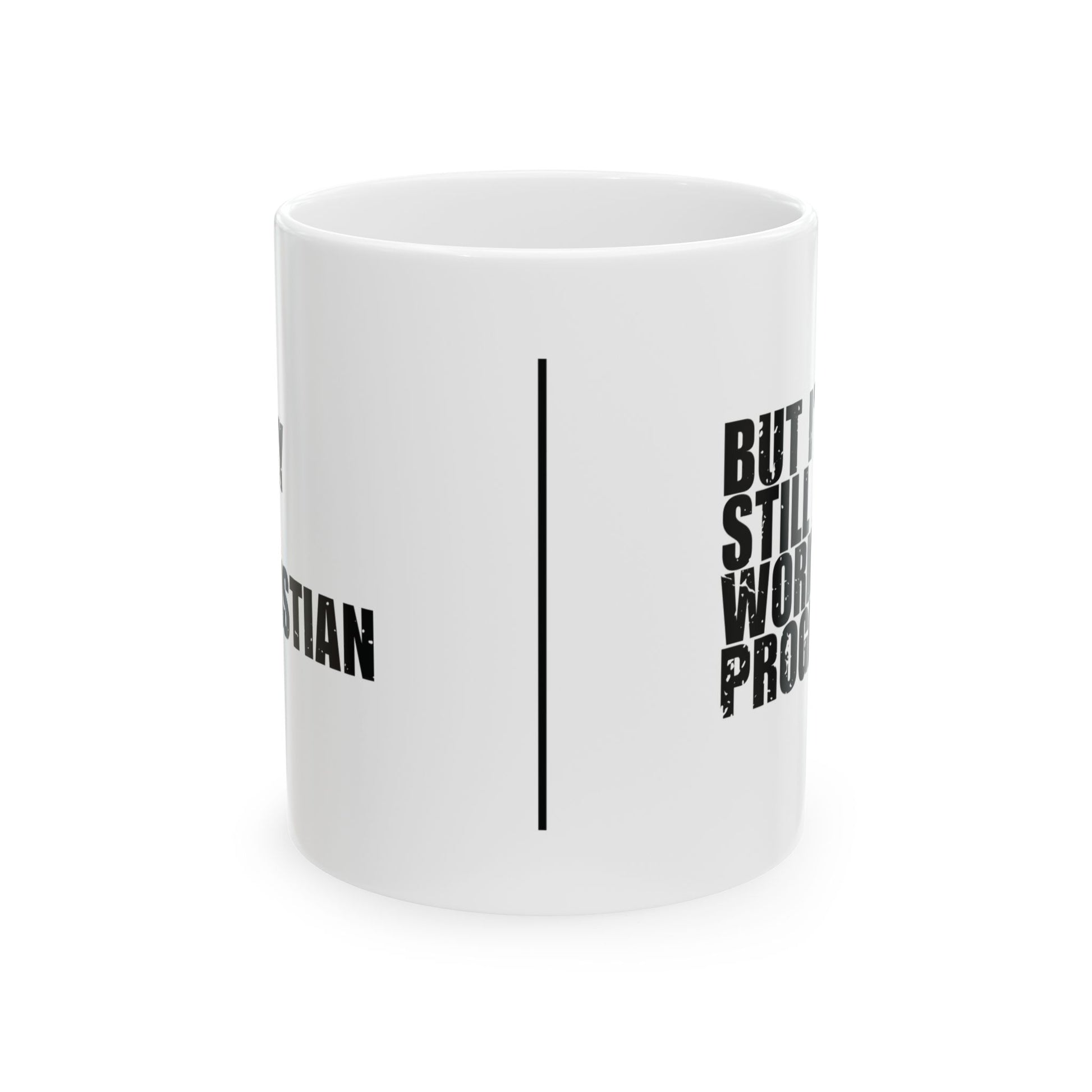 'I May Be a Christian, But I’m Still a Work in Progress' - Mug - (11oz, 15oz) - White - Distressed font.