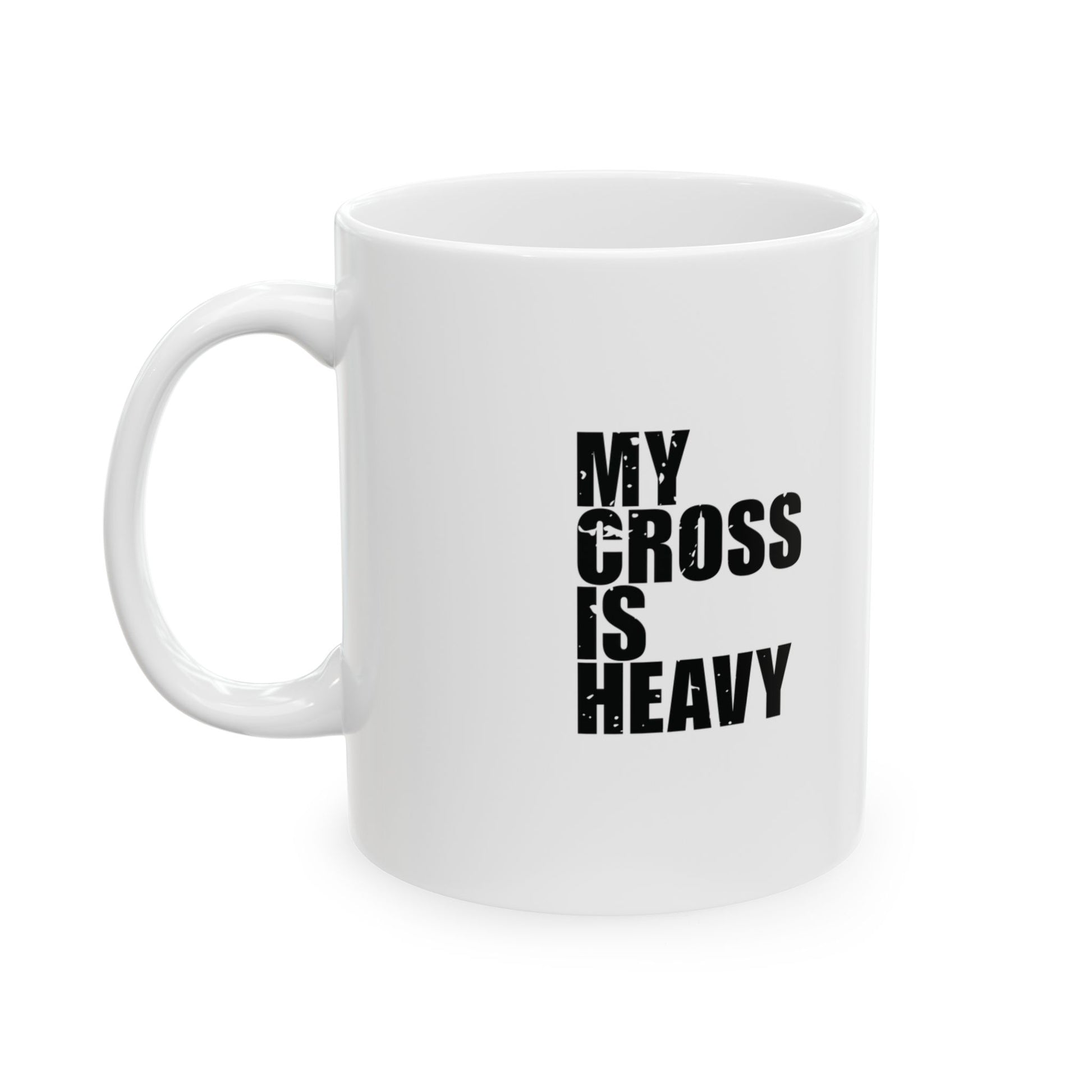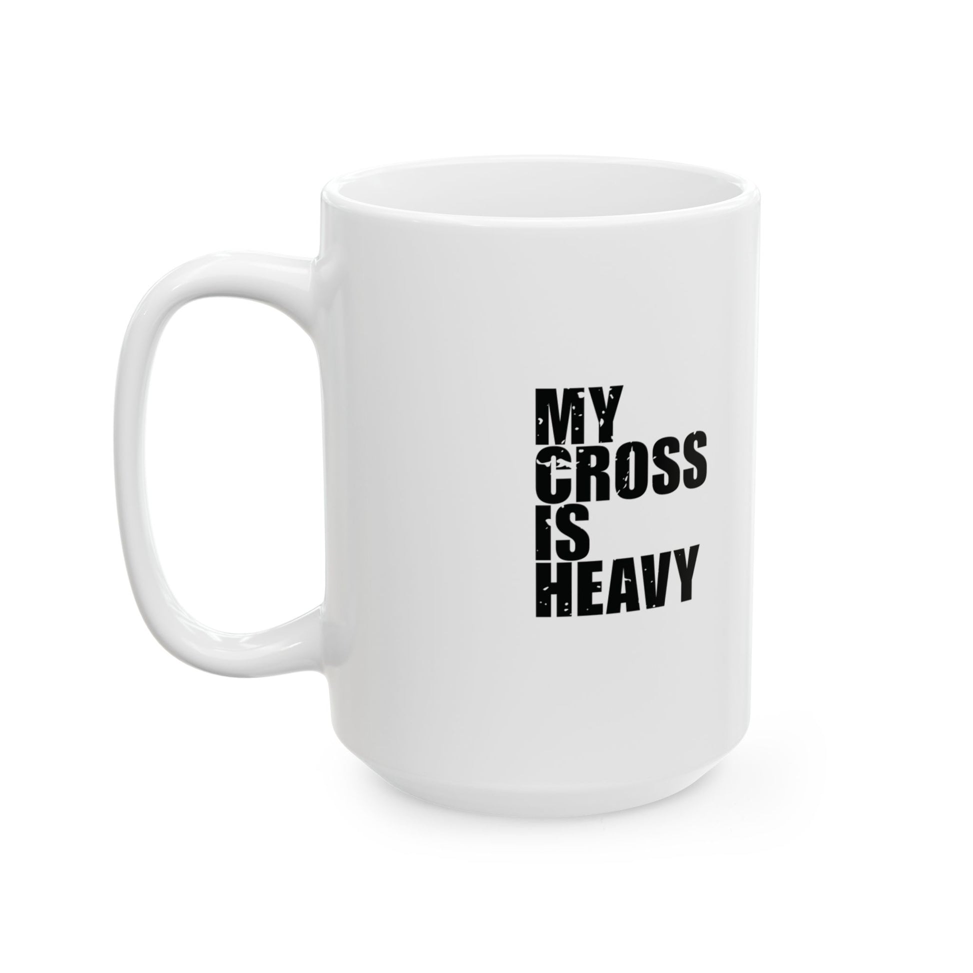 'My cross is heavy, but so is my sarcasm' - Mug - (11oz, 15oz) - White - Distressed font.