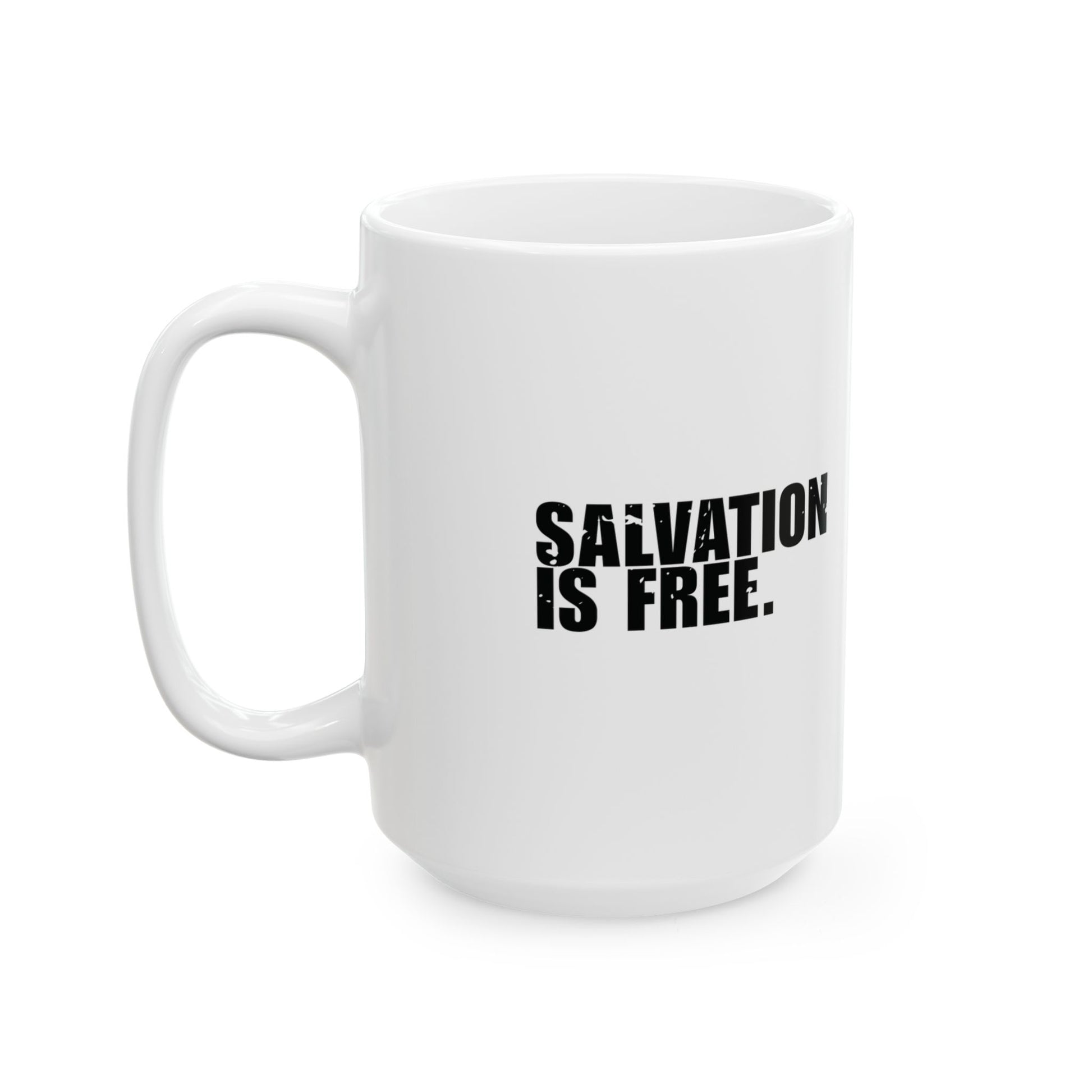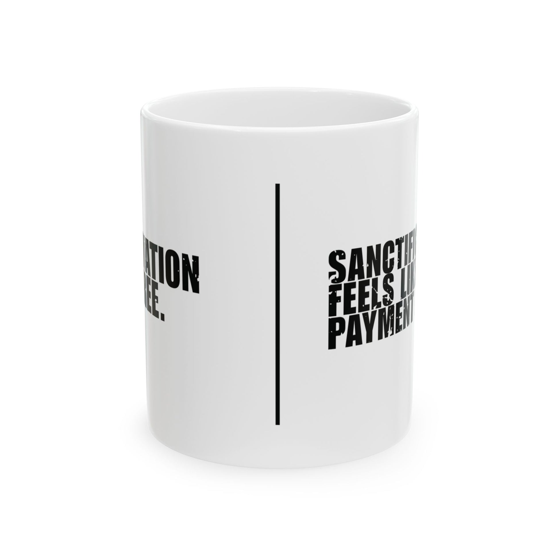'Salvation is free. Sanctification feels like a payment plan' - Mug - (11oz, 15oz) - White - Distressed font.
