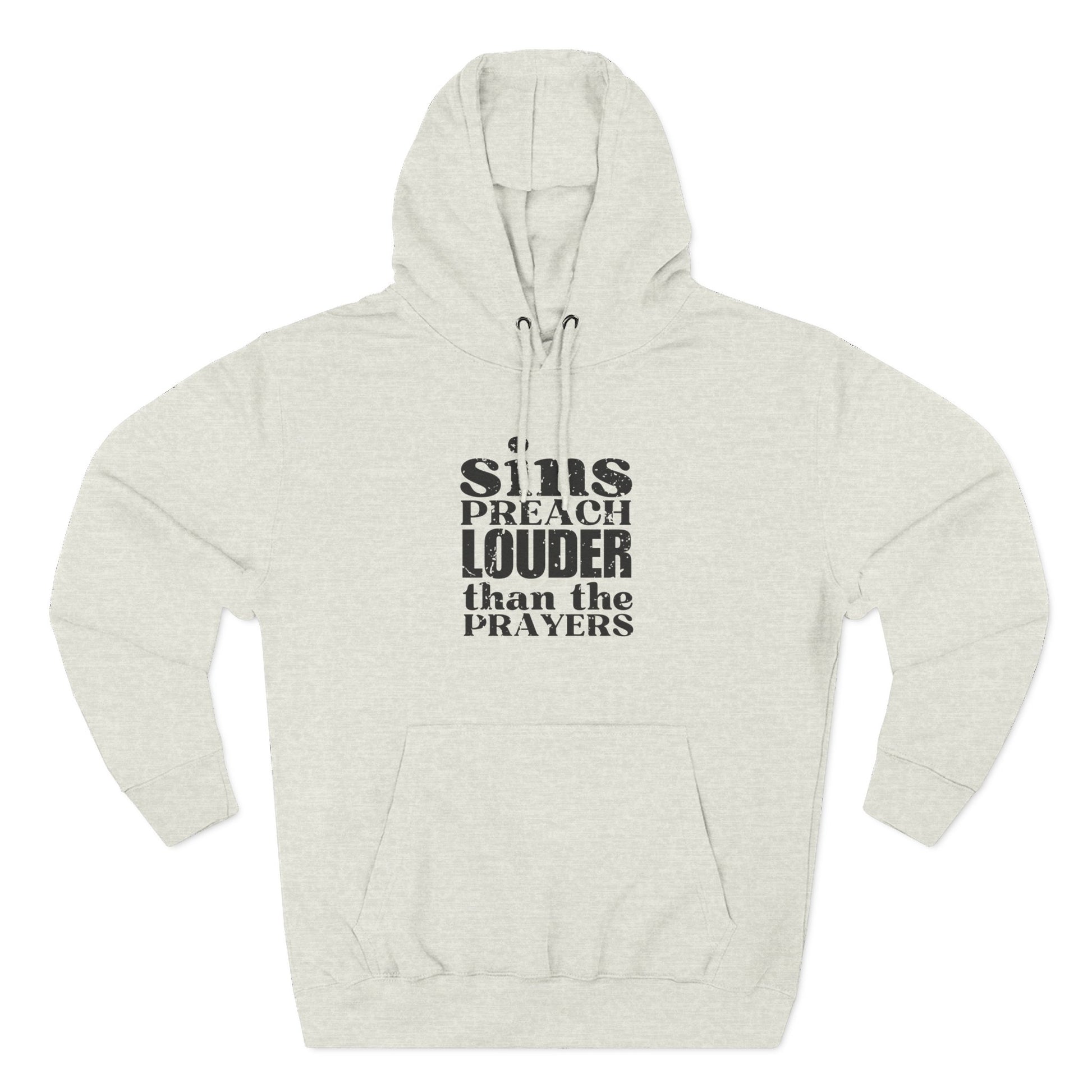 'sins preach louder than the prayers' Three-Panel Fleece Hoodie - Unisex - Distressed Font.