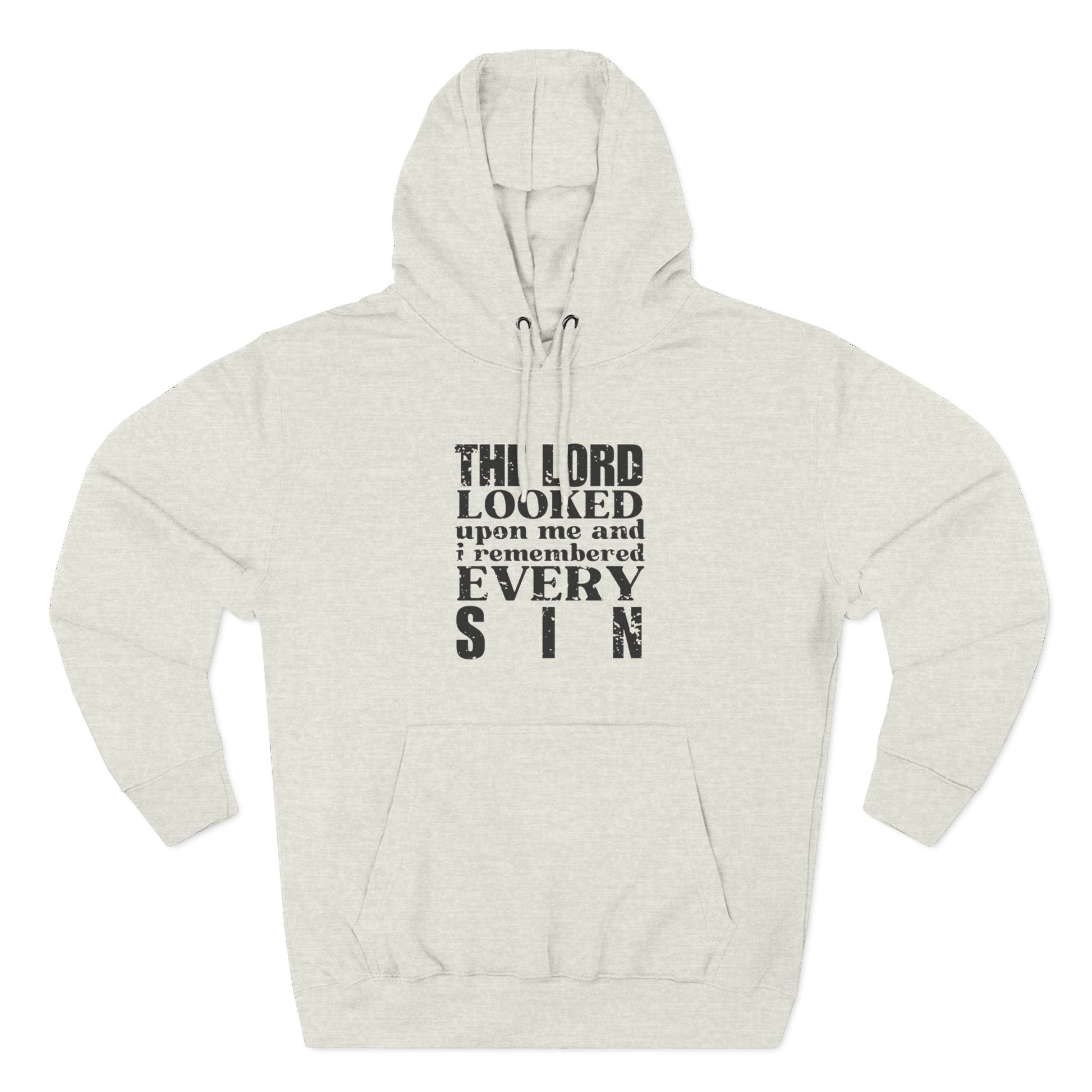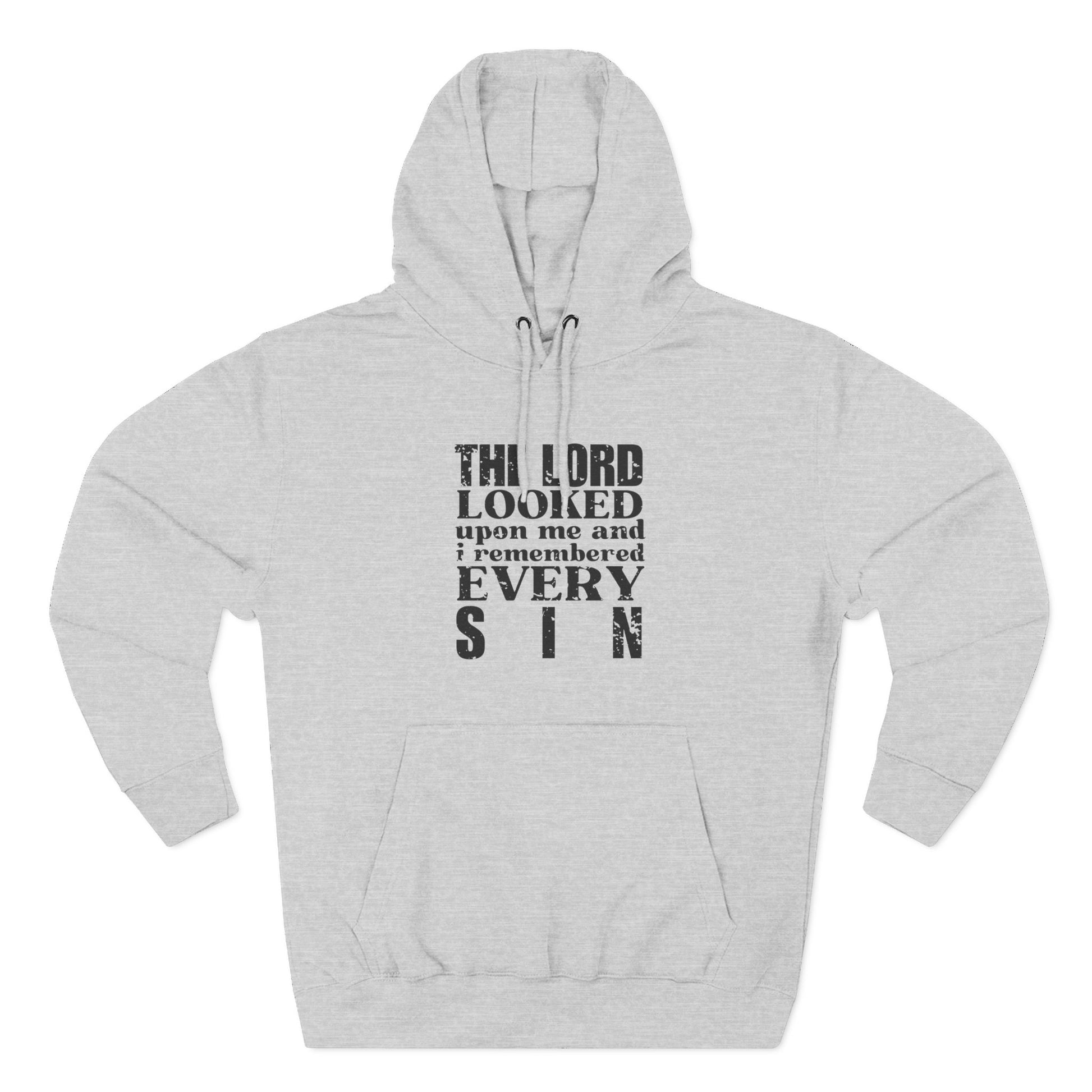 'The Lord looked upon me and I remembered every sin' Three-Panel Fleece Hoodie - Unisex - Distressed Font.