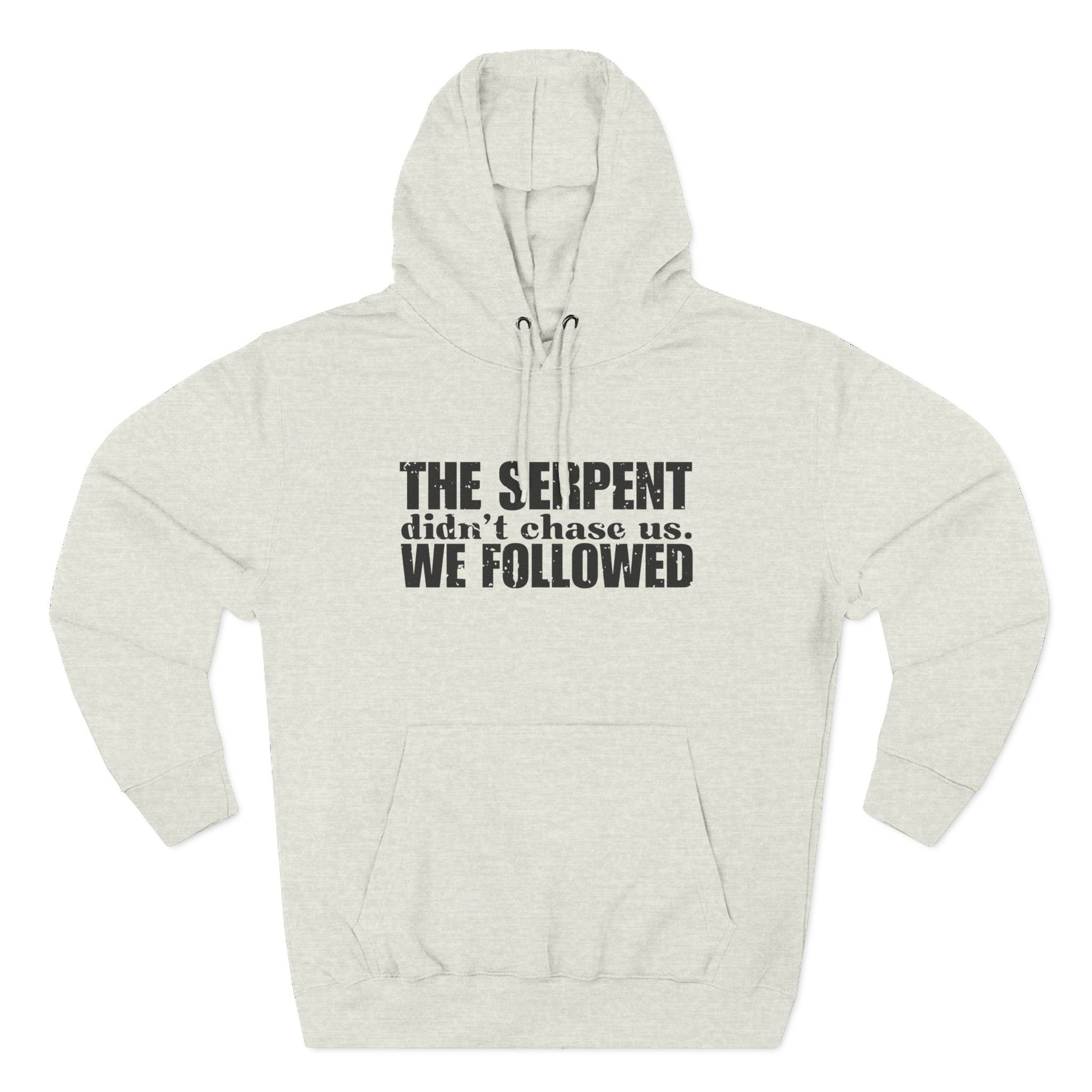'The serpent didn’t chase us. We followed' Three-Panel Fleece Hoodie - Unisex - Distressed Font.